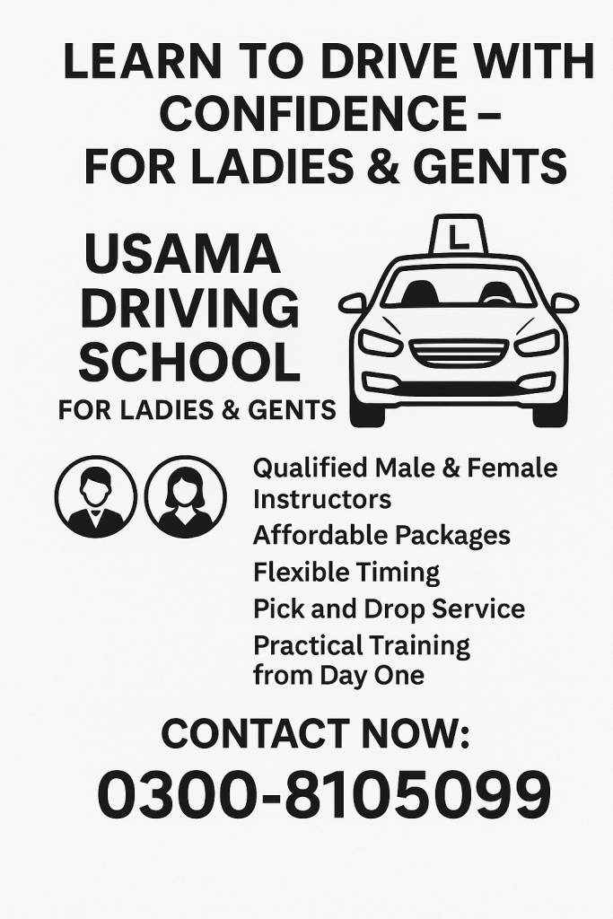 Need a driving school near you that’s professional, trusted, and affordable? Welcome to Usama Driving School for Ladies & Gents — where your journey to becoming a skilled driver starts!